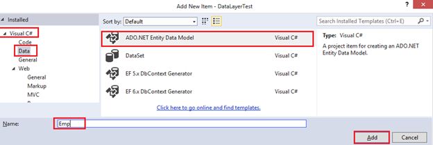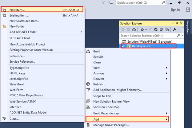 Now, I have to add an edmx file in the Data layer to access the database which I’ve just created. Right click the Data layer test project and a new item.
