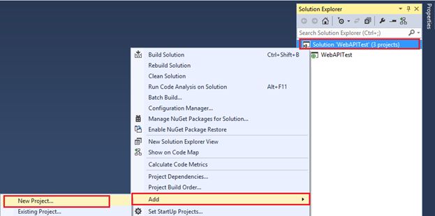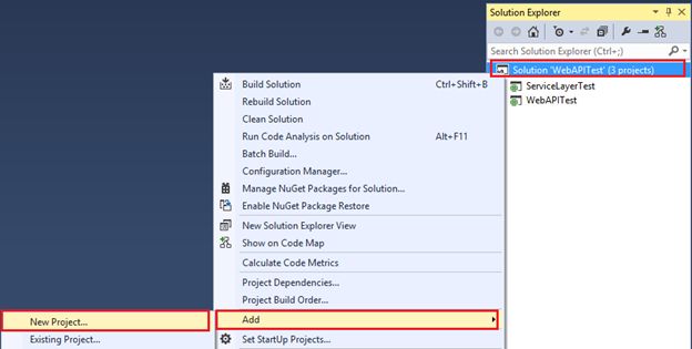 Our Web API project has been created. Now, I need to add a service layer project in my solution. Go ahead and right click onto solution and a new project.