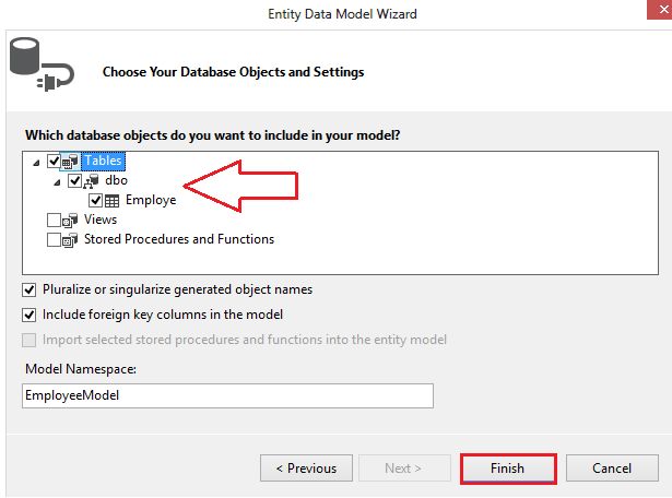 Table is listed here in the following screenshot; select and add the table as an entity. I have only one table that is Employee; select it and click finish.