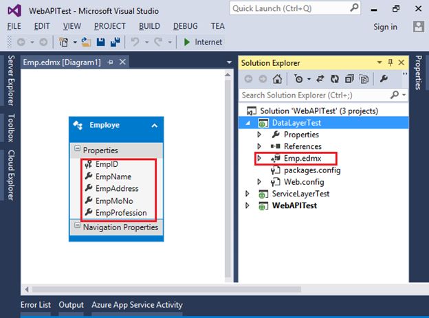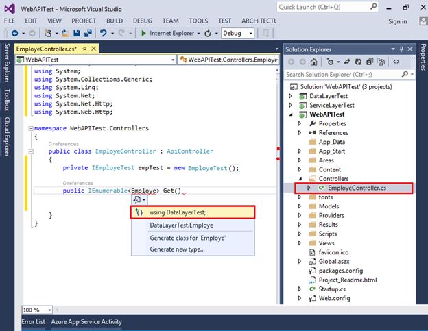 In the solution, as you can see, I have a project of Web API, which is dependent on the Data layer and Service layer. Add a service for this.