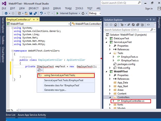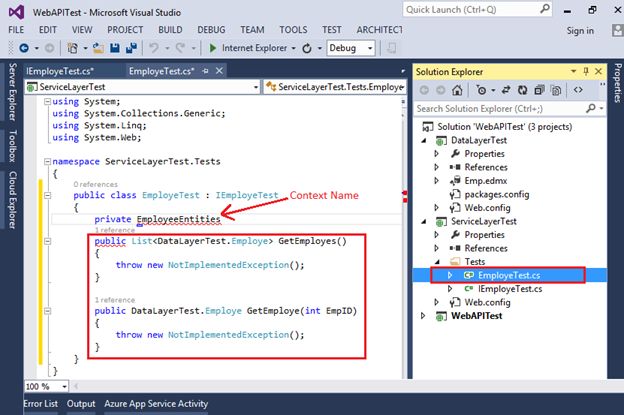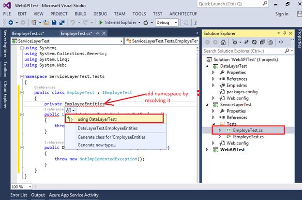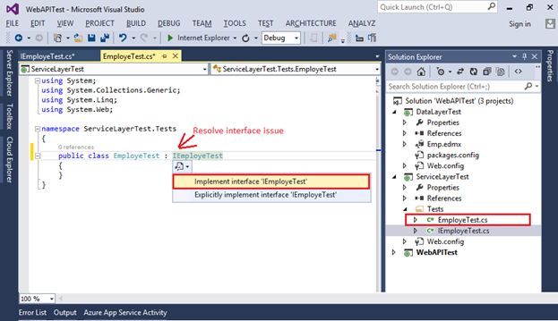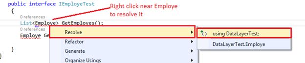 First of all, we need an instance of IEmployeTest interface and click to resolve it to from Service layer.