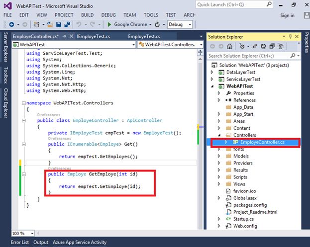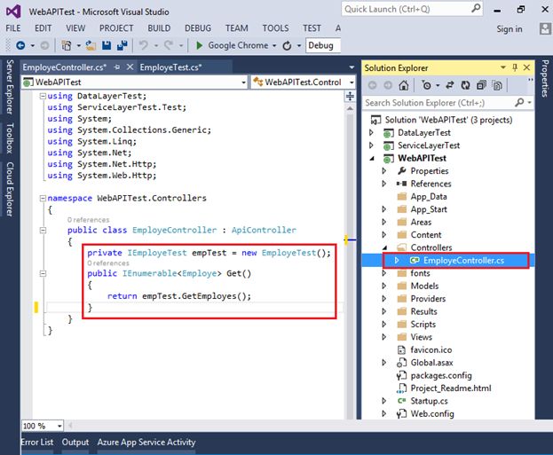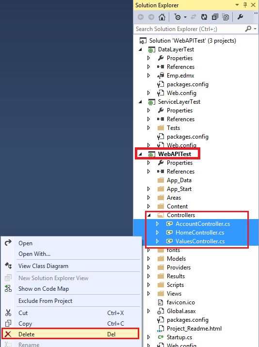Now, all is set in the Service layer test project. Our class is ready and our interface is ready as well. Now I'm going to work on Web API controller. In the Web API project, I have three controllers by default. Hence, just delete it. I want to create a new controller.