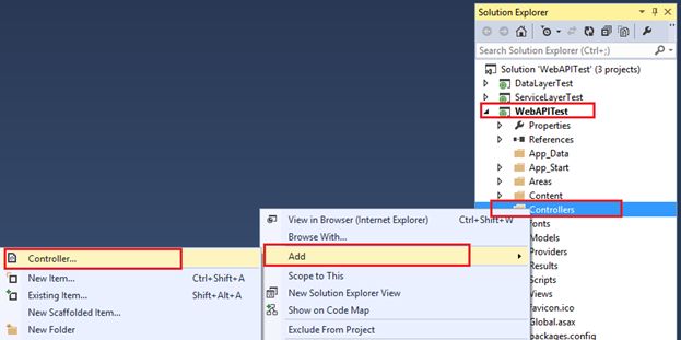 For creating a new controller, click on the controller’s folder under WebAPITest project and add a new controller.