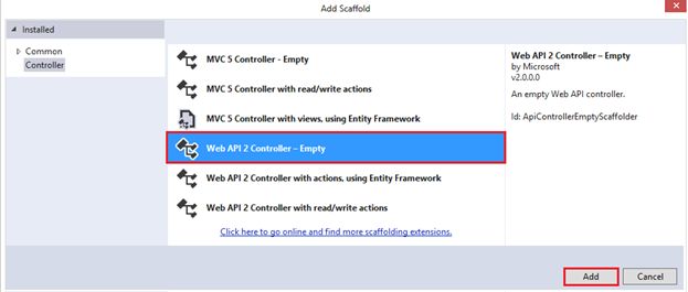 Choose Web API 2 Controller. Empty it from the controllers list and add it.