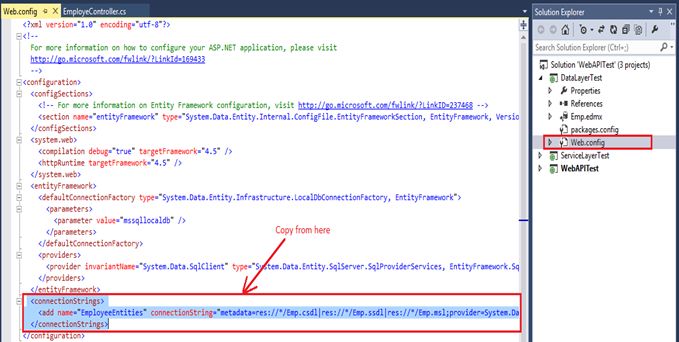 Now, I need to create a connection string in WebConfig file of my WebAPITest project. In the WebConfig of Data layer test, you can get a connection string. If you don’t want to write hardcode this connection string in the WebAPITest project’s WebConfig, then you can copy from here.
