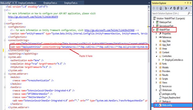 Paste this copied connection string in the WebConfig of WebAPITest project.