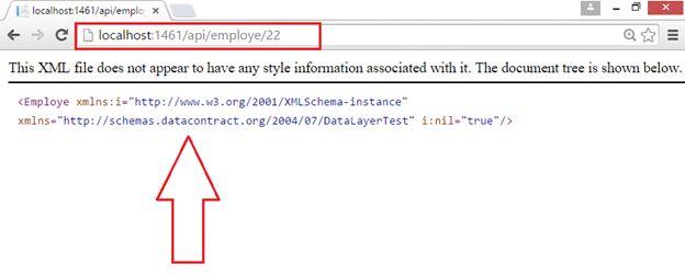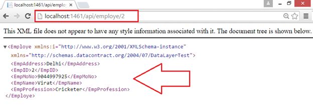 Similarly, pass EmpID 2 in URL, which is held by Employee 2, as expected, we got Employee 2 in XML representation.
