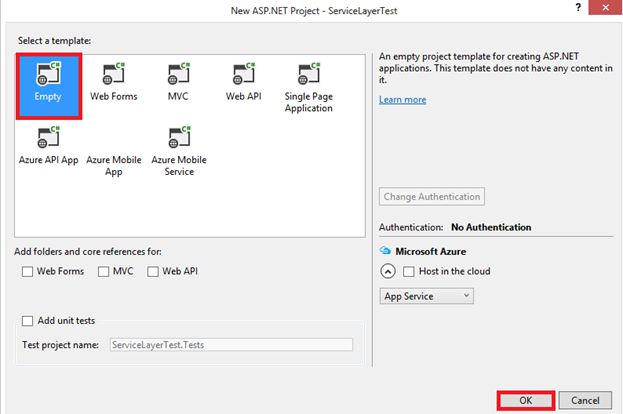 This figure is for the templates. In the Service layer project we’ll add a class and an interface. Hence, select an empty template and click the OK button to create it.