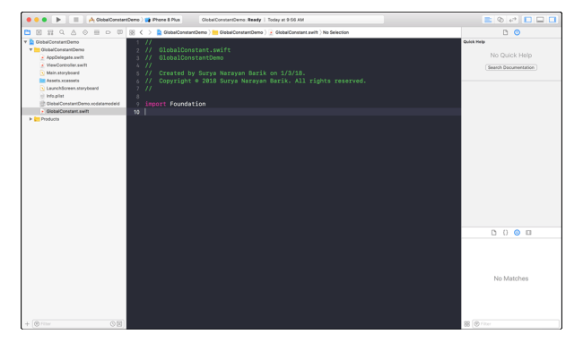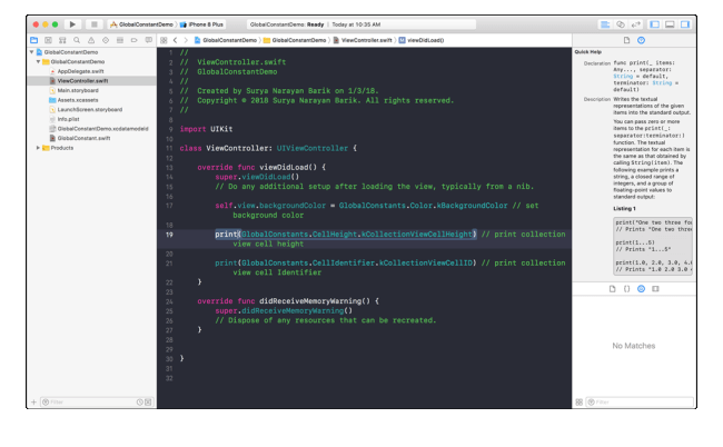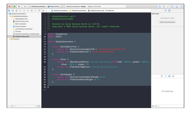 In our code, most of the time we use constants (Ex: cell Identifier, some static text, maybe certain height). It’s a good practice to use constants instead of variables whenever possible. Since their value can’t be changed afterward, it’s much safer and the compiler can make optimizations if the system knows certain data won’t change. It is always advisable to declare all the constants in a global file and access those constant from the global file itself. This technique has lots of advantages. Consider, we are using one constant "My Name" in 4 to 5 View Controllers. Then, after that we realize that constant should be "My Name is :", we need to go to all view controllers and search for that particular constant. Now, assume we have added the global constant somewhere in a Swift file like :