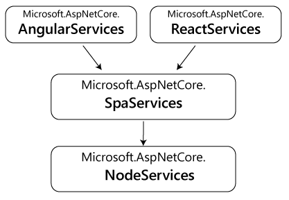 Now, we need to add the SPA Services for ASP.NET Core that Webpack offers. Webpack offers webpack-dev-middleware which serves the files emitted from Webpack to a connected Server, such as Kestrel or webpack-dev-server. These services will be available for other programming languages as well, such as Python, PHP etc., in the future. You can use Angular and React client framework as part of this Dev middleware which, in-turn, uses another NuGet package called NodeServices.