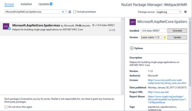 To add SPA services in the project, open the NuGet Package Manager and search for Microsoft.AspNetCore.SpaServices,