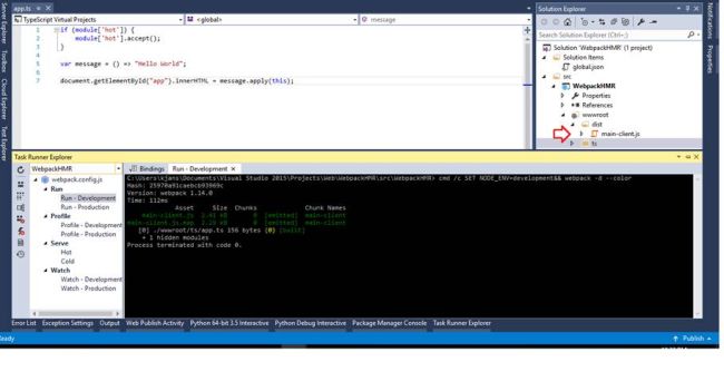 A module can only be updated if you accept it. This is what the lines 1-3 do. You must add these lines in order for HMR to work against your modules. Finally, open the Webpack Task Runner window and run the "Development" task of Webpack by right-clicking on it and click "Run". After running the Webpack, it will bundle up the compiled TypeScript file and will create a "dist" folder in the "wwwroot" containing the bundle.
