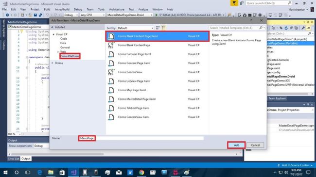 Select MaterDetailPageDemo right click to more options available select add option extract to click on New Item…