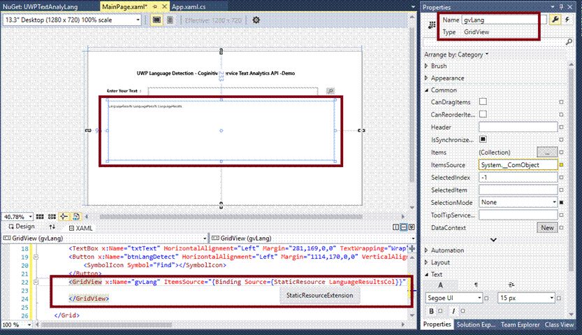 Open (double click) the file MainPage.xaml in the Solution Explorer and add the Newtonsoft.Json reference in the project. Right click your project (UWPTextAnalyLang) and select Manage NuGet Packages.