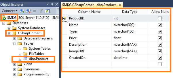 First, we will create a table in SQL Server to populate a Kendo Scrollview with the product(s) details in ASP.NET MVC Web application. I have created a table called "Product" with the following design.