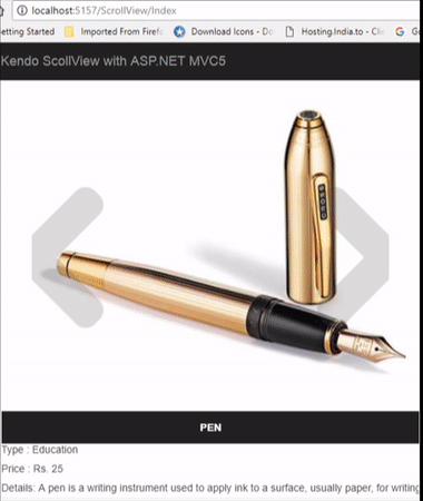 In this article, we have seen how to view the product details in our ASP.NET MVC5 web application with Kendo ScrollView using Entity Framework.