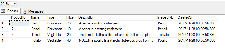 - VALUES (1, N'Pen', N'Education', 25, N'A pen is a writing instrument', N'Pen', CAST(0x0000A8390001E88B AS datetime))