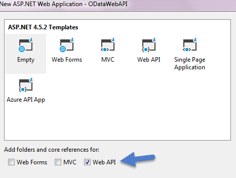 Next, select an Empty template and make sure to select Web API under Add folders.