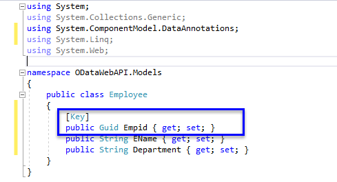 And once it is installed, let’s add our Employee class which will hold all the properties for Employees under Models folder. We can add properties based on our requirement but make sure they should match primary id property in Virtual Entity. So, we need to define at least one GUID property which should act as a Key, like following.