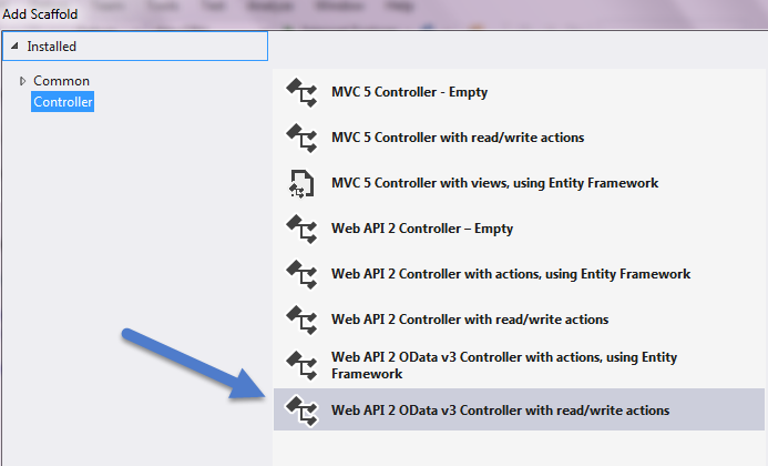 After that, the first thing you need to do is to install NuGet package to get the ODATA libraries, so you need to run the following command under Package Manager Console (Tools->NuGet Package Manager -> Package Manager Console).
