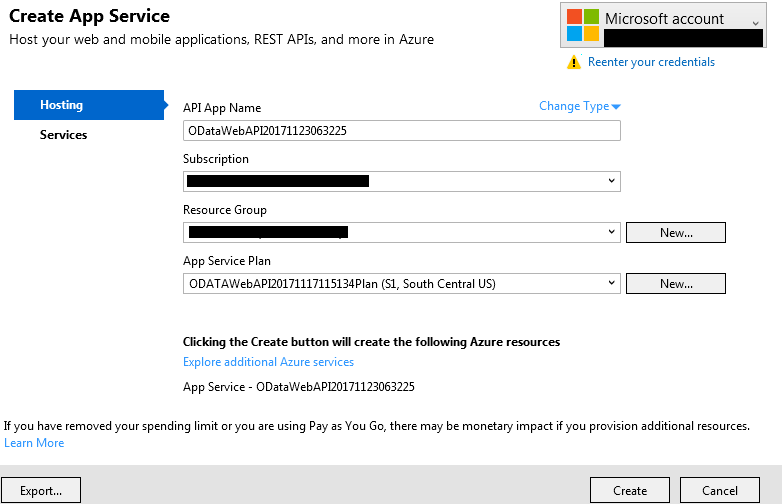 If you are deploying to Azure for the first time, it will ask you for signing in; use your Windows Azure credentials. Once logged in, you can select your subscription, Resource Group, AppServicePlan, and finally, click on "Create".