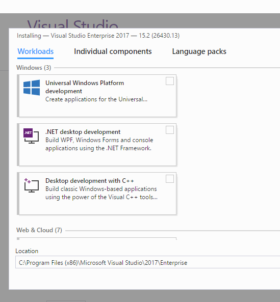 In case you don't need to install the full workload, Visual Studio 2017 allows you to select a specific component you want from the Individual Component tab, based on your needs.