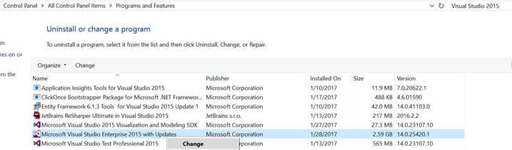 There are certain prerequisites that we need to take care of, while working on extensibility projects. If you have Visual Studio 2015 installed, go to Control panel >> Programs and features and search for Visual Studio 2015. Then, right click on it to select “change” option.