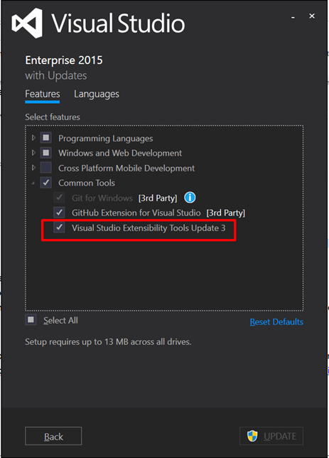 Here, we need to enable Visual Studio extensibility feature to work on this project type. On the next screen, click on “Modify”. A list of all selected/unselected features would be available now and all we need to do is to select "Visual Studio Extensibility Tools Update 3" in the Features-> Common Tools, as shown in following image.