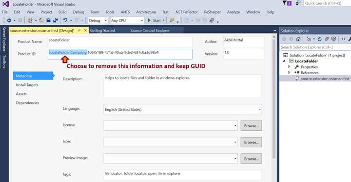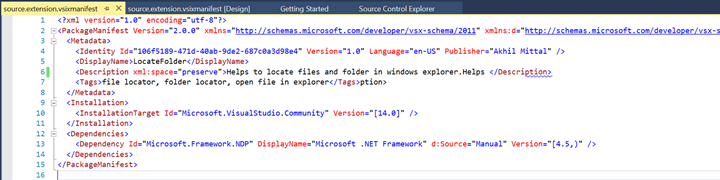 When we open the manifest file, we see certain kind of related information for the type of project that we added. We can modify this manifest file as per our choice for our extension. For e.g., in the ProductID, we can remove the text that is prefixed to the GUID and only keeps the GUID. Note that GUID is necessary as all the linking of items is done via GUID in VSIX projects. We’ll see this in more details later.