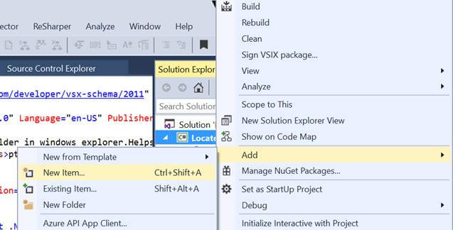 We have successfully added a new project and configured its manifest file but the real job is still pending - writing an extension to locate the file. For that, we need to add a new item to our project, so just right click on the project and select to add a new item from the items template.