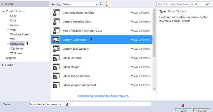 As soon as you open the item templates, you’ll see an option to add a new custom command under Visual C# items - > Extensibility. The custom commands act as a button in VSIX Extensions. These buttons help us to bind an action to its click event, so we can add our desired functionality to this button/command. Name the custom command you added. For e.g. - I gave it a name “LocateFolderCommand” and then press "Add" as shown in the below mentioned image.