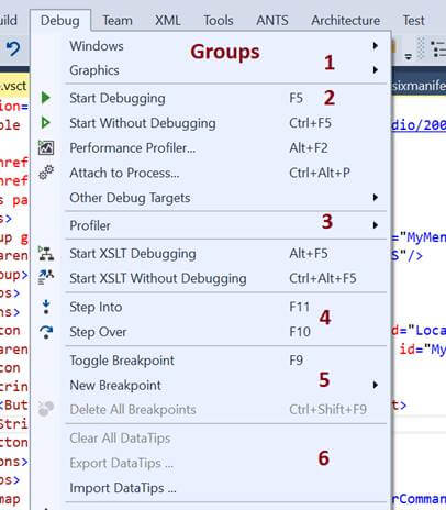 When we talk about “Groups”, it is grouping of commands that are shown in Visual Studio. Like in the below image, when in Visual Studio, you click on Debug, you see various commands like Windows, Graphics, Start Debugging… etc.