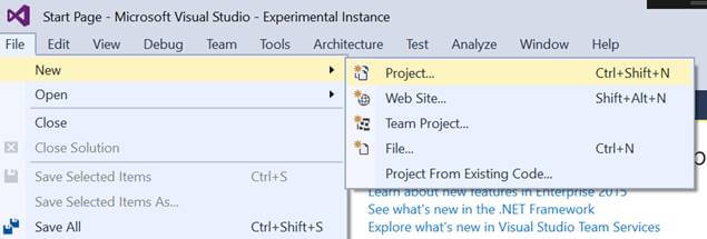 Create a new project like we create in every other project in Visual Studio. Select File->New->Project.