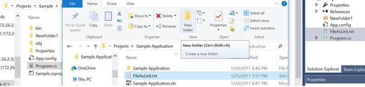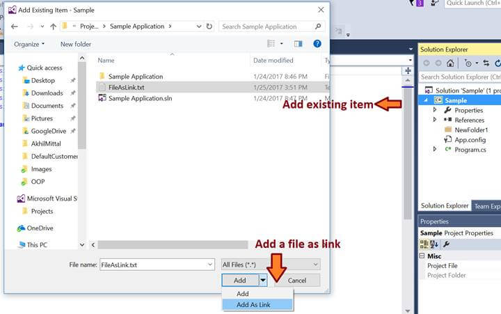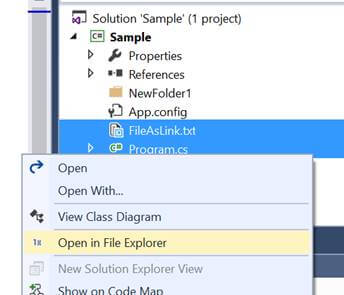 This functionality also works for the linked files in Visual Studio. Let’s check that. Add a new item in the project opened in experimental instance and add a file as a link, as shown in the following image.