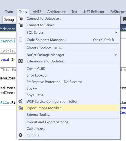 Remember, when we started this tutorial, I mentioned to download and install VS Extensibility Tools? VS Extensibility Tools provide some cool features that you can really leverage. For example, it allows you to export all the available images in Visual Studio. We can use these images to make our icon and default image for the extension. To start with, in Visual Studio where your code was written, go to “Tools >> Export Image Moniker…”