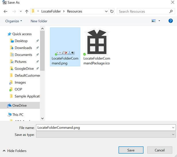 We’ll use this image only for our extension. Give it a size 16*16 and click "Export". Save that in your "Resources" folder of the project. Replace the already existing "LocateFolderCommand.png" file with this file and give this new exported file the same name. Since in the .vsct file, it was defined that the prior image sprint has to be used with first icon, so we always got to see 1X beside the custom command text, but we need a good looking meaningful image now. So, we exported this “open in explorer” image.