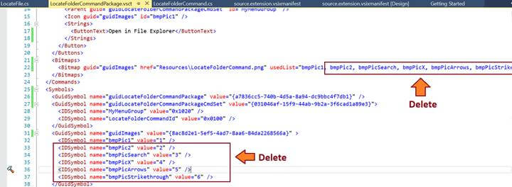 Now, go to .vsct file. In the Bitmaps, first delete all the image names in the list except bmpPic1 from the usedList and in the GuidSymbol, delete all IDsymbol except bmpPic1. We do not need to change the href link in Bitmap node because we replaced existing image with the newly exported image with the same name. We did this because we are now not using that old default image spirit but we are using now our newly exported image.