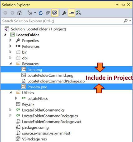 Export both the images with the name Icon.png and Preview.png respectively in the Resources folder. Then, in the Solution Explorer, include those two images in the project, as shown below.