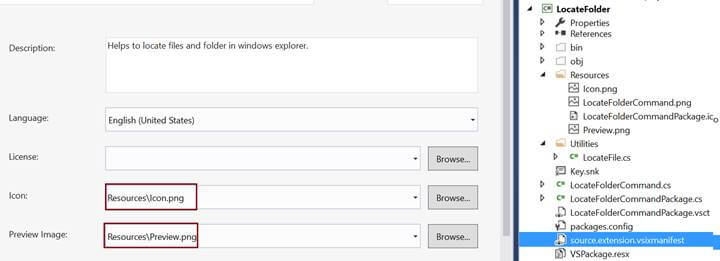 Now, in the source.extension.vsixmanifest file, set the Icon and Preview images to the same exported images as shown in following image.