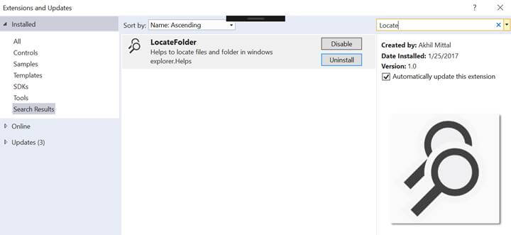 Now go to extensions and updates and search for the installed extension “LocateFolder”. You’ll see a beautiful image before your extension, this is the same image with dimensions 90X90 and in the right side panel, you can see the enlarged 175X175 preview image.