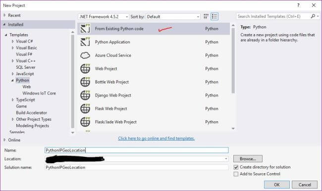 Name the project "PythonIPGeoLocation" and click OK, as shown below.