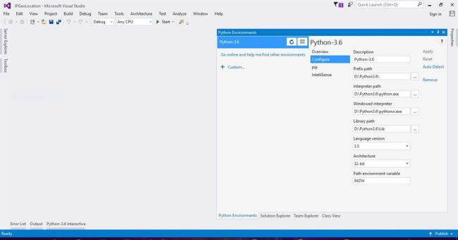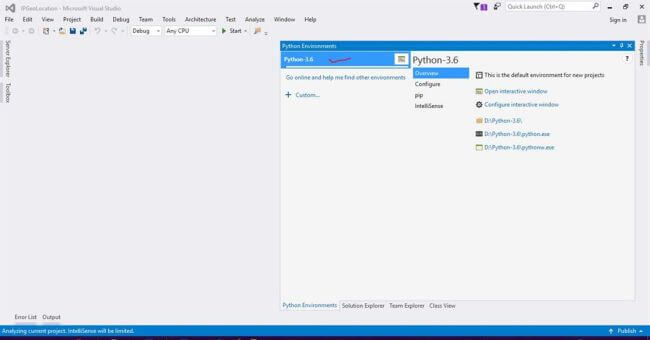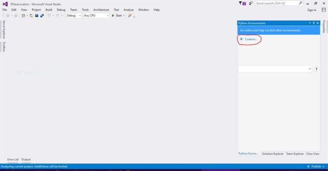 "Python Environment" Window will open next to "Solution Explorer" Window, click "+ Custom" link, as shown below.