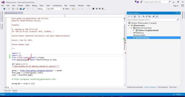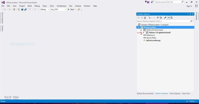 You will see that your Python project has been created in Visual Studio 2015, as shown below.