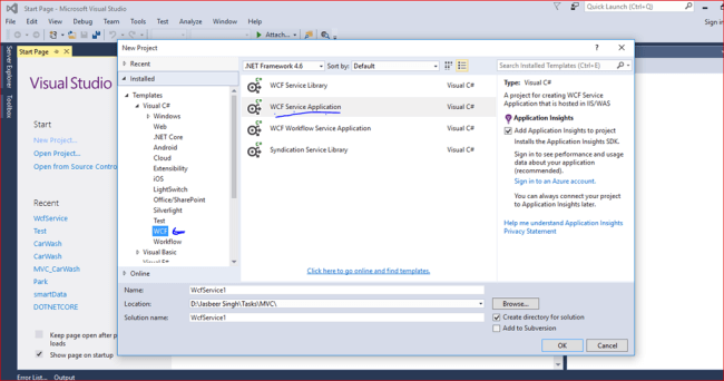 - Open Visual Studio and select New project. In the dialog box, select WCF -- > SCF Service Application.