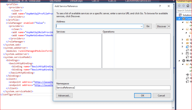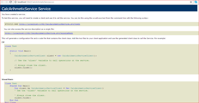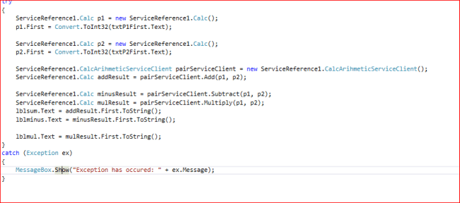 A proxy class CalcArihmeticServiceClient has been generated when we added a Service reference. Now, we will use this proxy class to call the methods of the WCF Servce and then see the results.