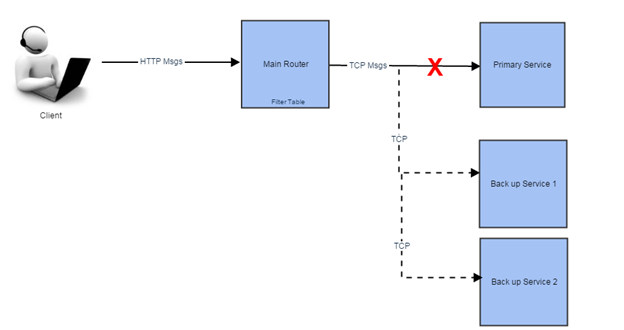 In the snapshot, given above, you can find that the client communicates with the main router. It is not aware of the Primary Service or Backup Service. When the router receives the request from the client, it usually tries to process it with the primary Server. If the primary Server is not reachable for any reasons, the main router then automatically tries to connect with the Backup Service 1. If the Backup Service 1 is available, the request would be processed and send the response to the client. If the Backup Service 1 is also not available, it would send the request to Backup Service 2 to get it processed.