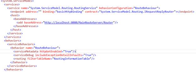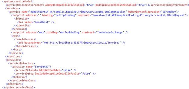 Now, you have successfully hosted the Services Primary, Backup Service 1, and Backup Service 2. Now, it is time to define the Routing Service, which will pass the messages to the appropriate Service, based on availability. As I have already mentioned in my previous articles, we shouldn’t forget this simple sentence “Address the filter and filter end” . It is just a sentence I have framed myself to remember the RoutingServer configuration steps, which are Address, Filter table, Filters and endpoint, As I shown in the Figure 1.3 snapshot configure the Routing Service accordingly
