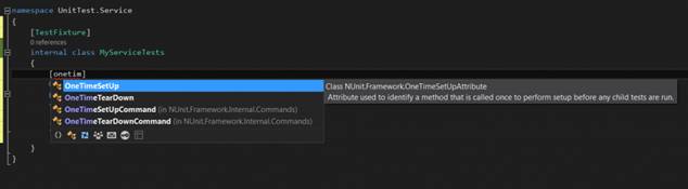 Now, we can install NUnit to our test project from NuGet Package. Once you add the package, you will be able to add the preceding namespace in our MyServiceTests class.