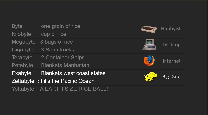 Think 15 years back, when we were using computers. What was Data at that time? It was in bytes or kilobytes mostly. Then, we moved to desktops and data increased to Megabytes and Gigabytes. Then, the World Wide Web got introduced and data increased exponentially, and reached to Terabytes and Petabytes. The following image demonstrates it: