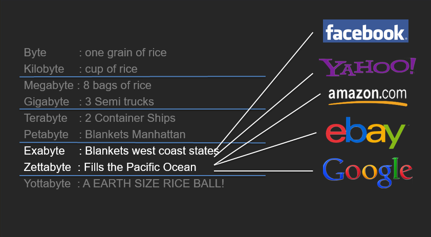 Now today, big companies like Microsoft, Google, eBay, Amazon, and Netflix all have a lot of data about users. The whole data in the world has doubled in just last two years. Today, data is available in Exabytes and Zettabytes. The following image may clear the concept.